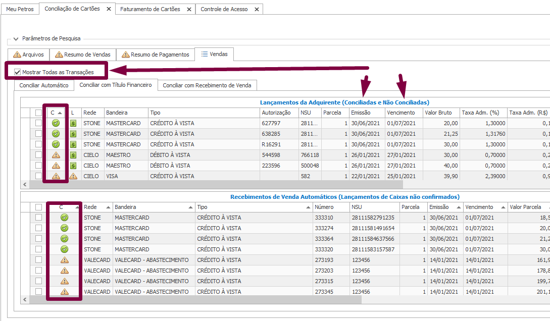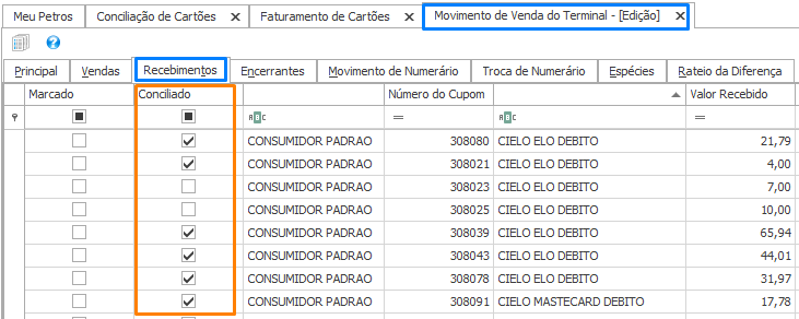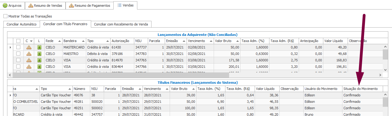 No movimento de venda a coluna Conciliado mostra se o cartão já foi conciliado ou não