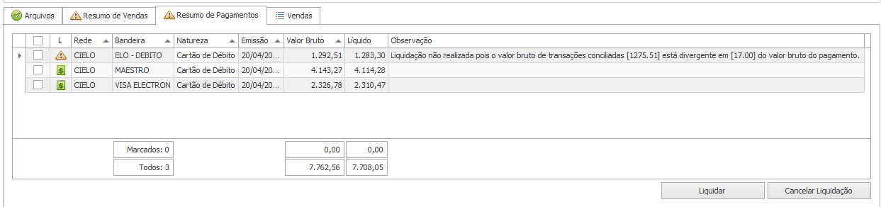 Mostra o total de pagamentos por rede, bandeira, natureza e conta sinalizando se o pagamento está ou não liquidado.