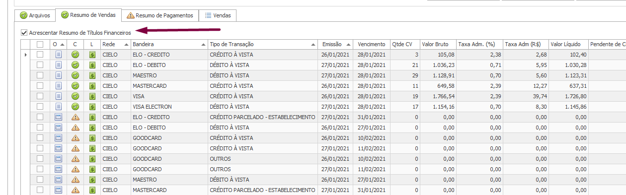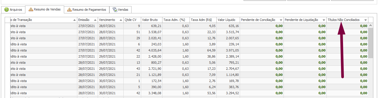 Criada a coluna Títulos não conciliados na aba resumo de vendas para totalizar títulos que sobraram sem ter transação pendente.