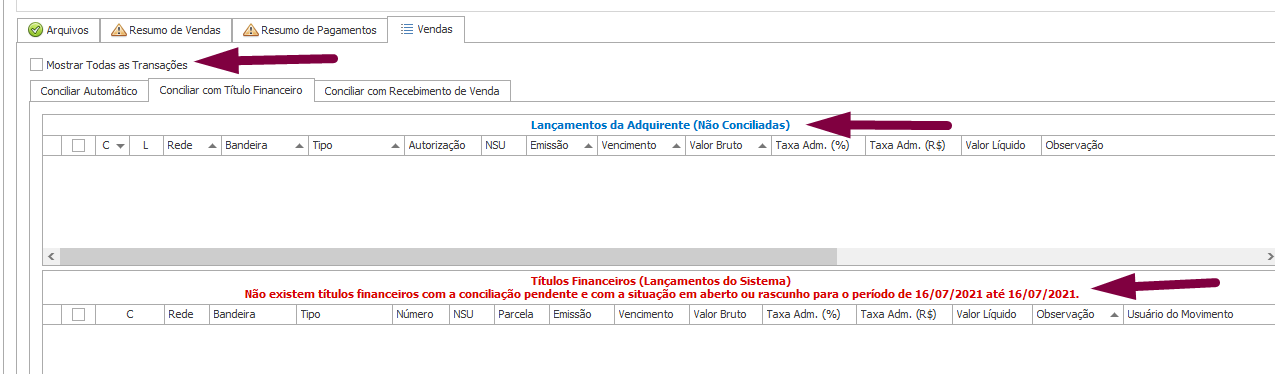 Criação da opção para Mostrar Todas as Transações na aba de Vendas que, quando habilitada, permite visualização de transações e títulos conciliados e não conciliados.