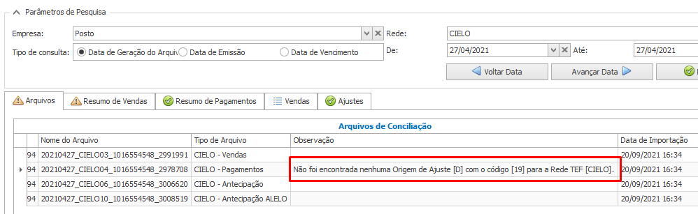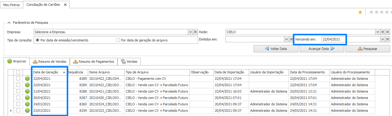 Pesquisando por data de emissão 20/04 a aba Arquivo traz um arquivo de vendas gerado dia 21/04 e um arquivo de pagamentos gerado dia 22/04, ou seja, os dois arquivos contém vendas emitidas dia 20/04.