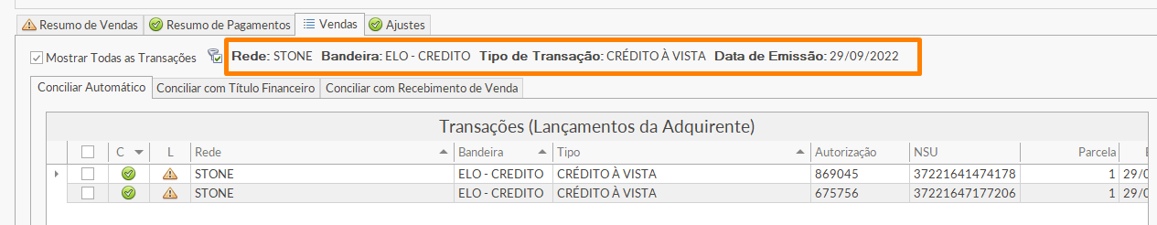 Todos os dados mostrados no Grid da Transação vem dos códigos cadastrados na REDE TEF, ou seja, representam a interpretação que o sistema fez do extrato eletrônico através da ETL com base nos códigos informados.
