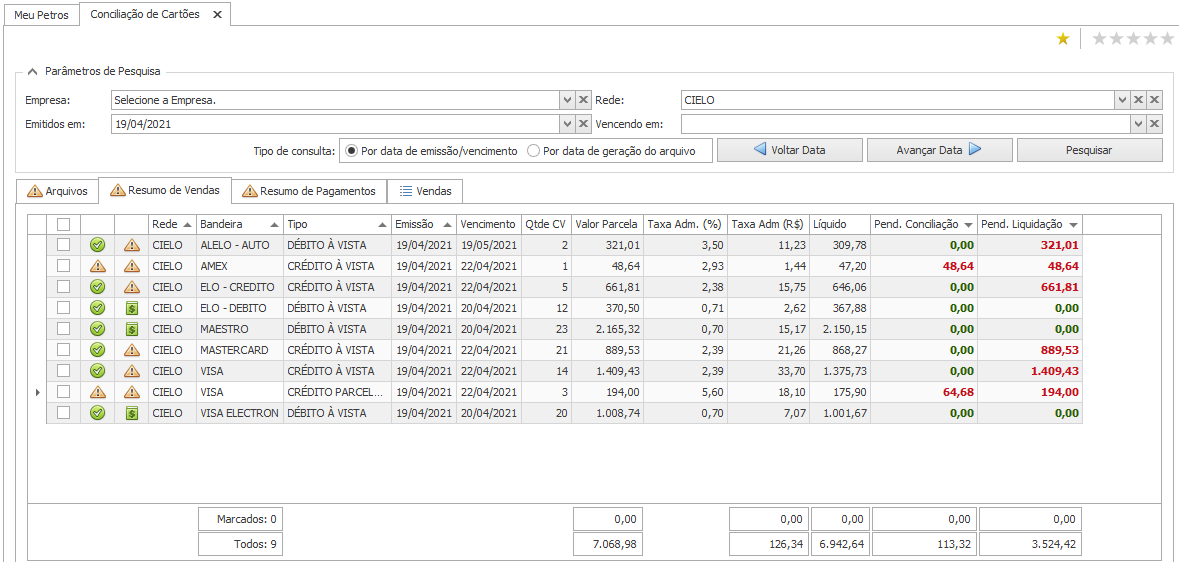 Mostra o total de vendas por rede, bandeiras e tipo de transação sinalizando se está ou não conciliada e liquidada.