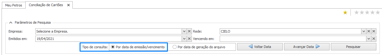 Para conciliar cartões em versões anteriores à 2.21.05.04 consulte o manual Faturamento de Cartões com Conciliação