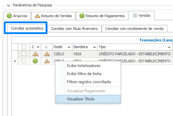 Filtrar registro conciliado Mostra o título que foi conciliado com a transação
