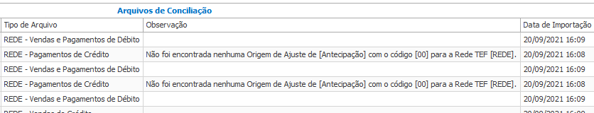 As bandeiras que estão sendo usadas na REDE TEF vinculada aos códigos da adquirente tem que ser as mesmas bandeiras vinculadas às formas de recebimento. A mesma regra vale para REDE e tipo de transação.